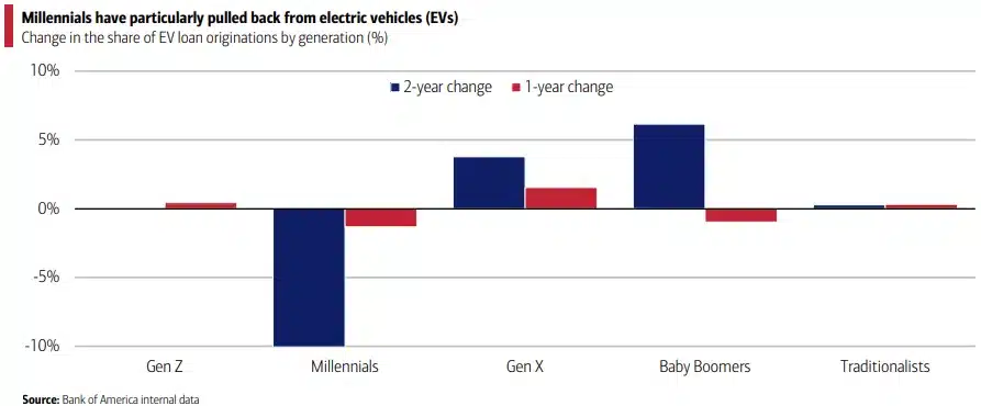 “Dados de concessão de empréstimos automotivos do Bank of America sugerem que a geração Millennial esteve no centro dessas mudanças: nos últimos dois anos, eles reduziram seus gastos mais do que qualquer outra geração“, diz o BofA.