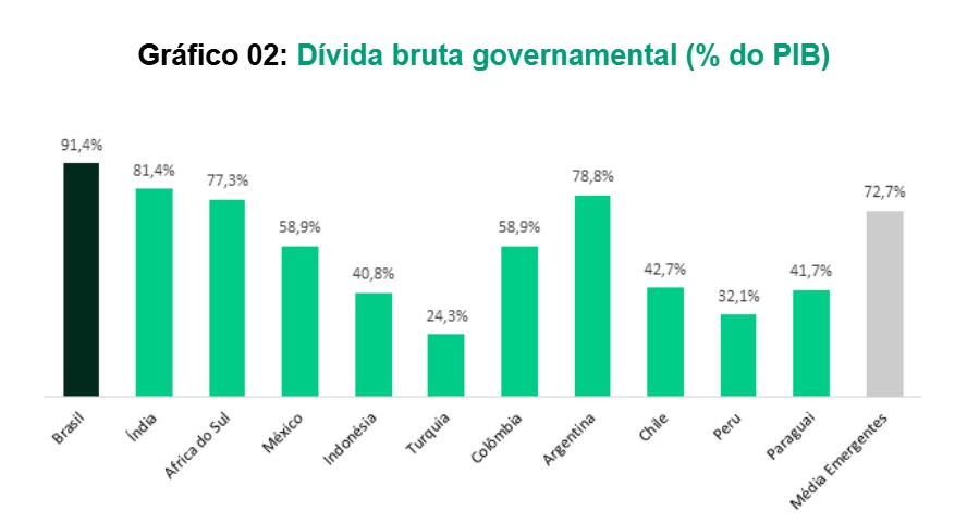 As projeções reforçam a preocupação: a relação dívida/PIB deve atingir 77,6% ao final de 2025 e 82,4% em 2026, mantendo tendência de alta até pelo menos 2035. Esse nível já se mostra elevado para economias emergentes, como evidencia abaixo o comparativo internacional baseado nos dados do FMI.