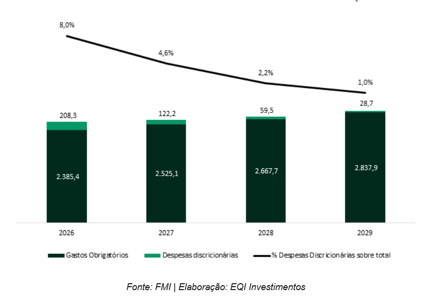 Segundo a Lei de Diretrizes Orçamentárias (LDO) de 2026, esse percentual deve continuar avançando até praticamente esgotar o espaço para despesas discricionárias por volta de 2029.