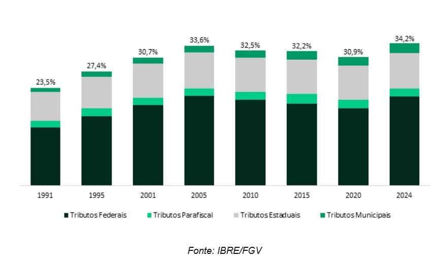 A deterioração fiscal ocorre apesar de um ambiente de forte arrecadação. Nos últimos anos, a carga tributária vem subindo de maneira consistente, com 2024 registrando o maior patamar da série histórica.