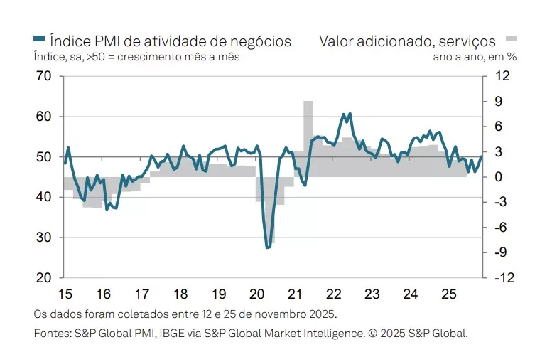 O PMI de serviços do Brasil voltou a registrar crescimento em novembro, após sete meses consecutivos de contração. O Índice de Gerentes de Compras (PMI, na sigla em inglês) subiu de 47,7 em outubro para 50,1 no mês passado, seu maior patamar em oito meses.