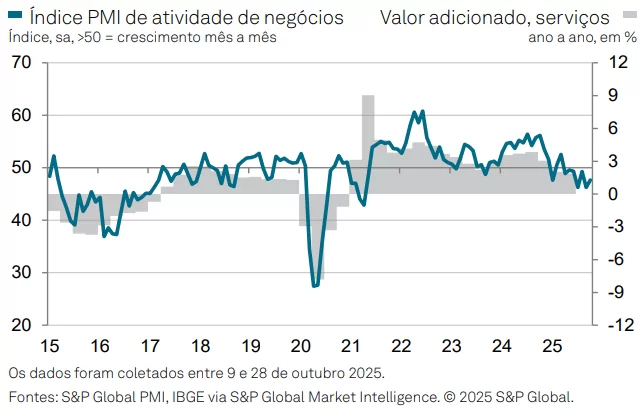 O PMI de serviços do Brasil em outubro registrou 47,7 pontos, segundo dados da S&P Global, um avanço em relação aos 46,3 pontos observados em setembro. Apesar do movimento positivo, o indicador permanece abaixo da linha de 50,0, que separa crescimento de retração, marcando o sétimo mês consecutivo de queda na atividade. O resultado indica que o setor ainda enfrenta dificuldades para recuperar ritmo em meio a uma demanda fraca e custos crescentes.