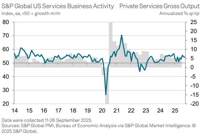 O PMI de serviços dos EUA de setembro apresentou recuo para 54,2 pontos, ante 54,5 pontos registrados em agosto, segundo dados divulgados pela S&P Global. Apesar da desaceleração, o índice permanece acima da marca crítica de 50 pontos, que separa expansão de contração, sinalizando o 32º mês consecutivo de crescimento no setor de serviços.