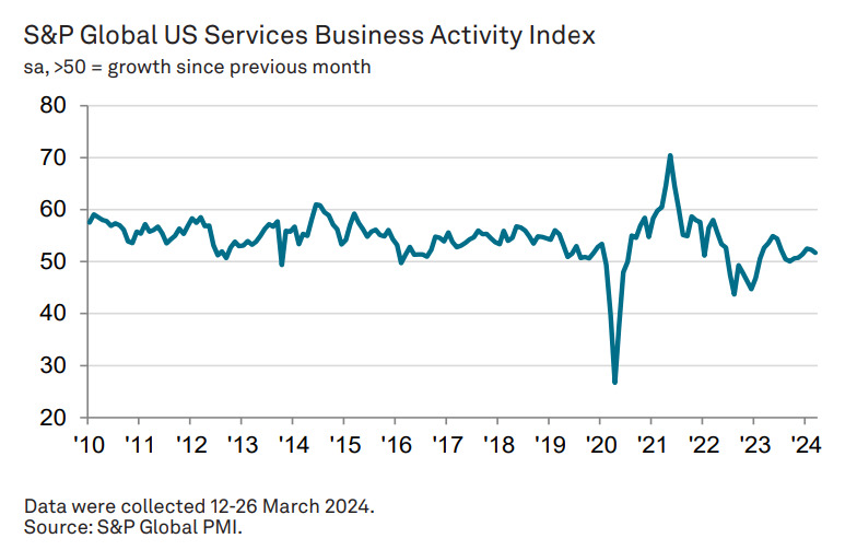 O Índice de Gerente de Compras (PMI, na sigla em inglês) do setor de serviços dos Estados Unidos recuou para 51,7 em março, em relação aos 52,3 pontos de fevereiro. O resultado do PMI de serviços dos EUA permaneceu acima da marca de 50,0, o que sinaliza um aumento na atividade empresarial pelo 14° mês consecutivo.