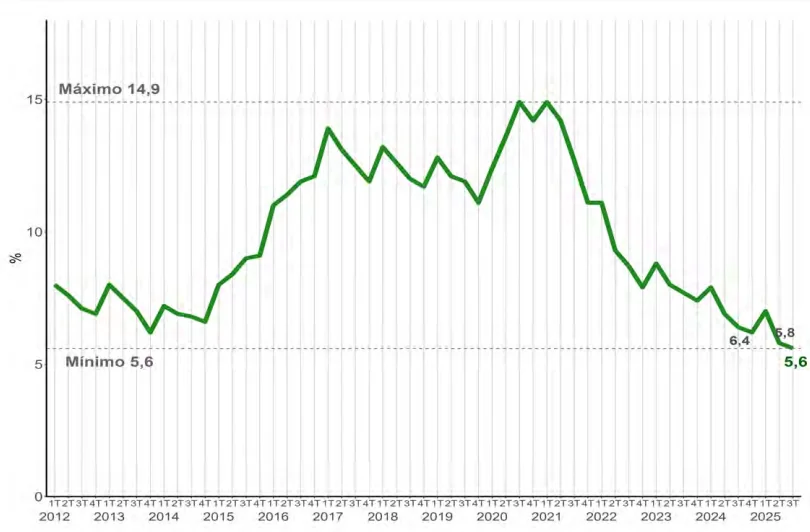 A taxa de desocupação no 3TRI25 chegou a 5,6%, o menor nível da série histórica iniciada em 2012, segundo a PNAD Contínua divulgada pelo IBGE. Embora o índice tenha recuado apenas em duas unidades da federação na comparação com o trimestre anterior, o país mantém estabilidade em grande parte do território e sinaliza um mercado de trabalho mais ajustado.