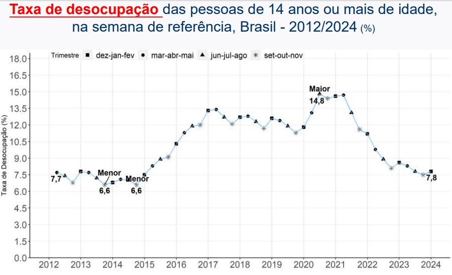 Segundo informações da Pesquisa Nacional por Amostra de Domicílios (PNAD) Contínua do IBGE, A taxa de desocupação chegou a 7,8%, no trimestre encerrado em fevereiro de 2024, com alta de 0,3 ponto percentual em relação ao trimestre encerrado em novembro de 2023.