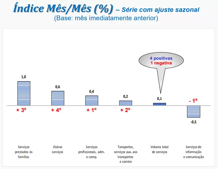 A única queda veio de informação e comunicação (-0,5%), que devolveu o ganho do mês anterior. A redução foi influenciada por uma menor demanda em serviços de TI, manutenção e exibição cinematográfica, após um julho impulsionado pelas férias escolares.