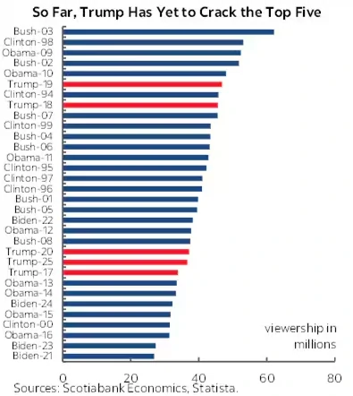 O Scotiabank destaca que o discurso foi o mais longo da história, durando 1 hora, 47 minutos e 46 segundos. No entanto, o banco adverte que o tempo gasto não se traduziu em profundidade. Segundo a análise, “se o seu foco for colher novas informações sobre inclinações políticas, eu não recomendo”, aponta o Scotiabank, indicando que o evento serviu mais como espetáculo do que como anúncio de diretrizes.