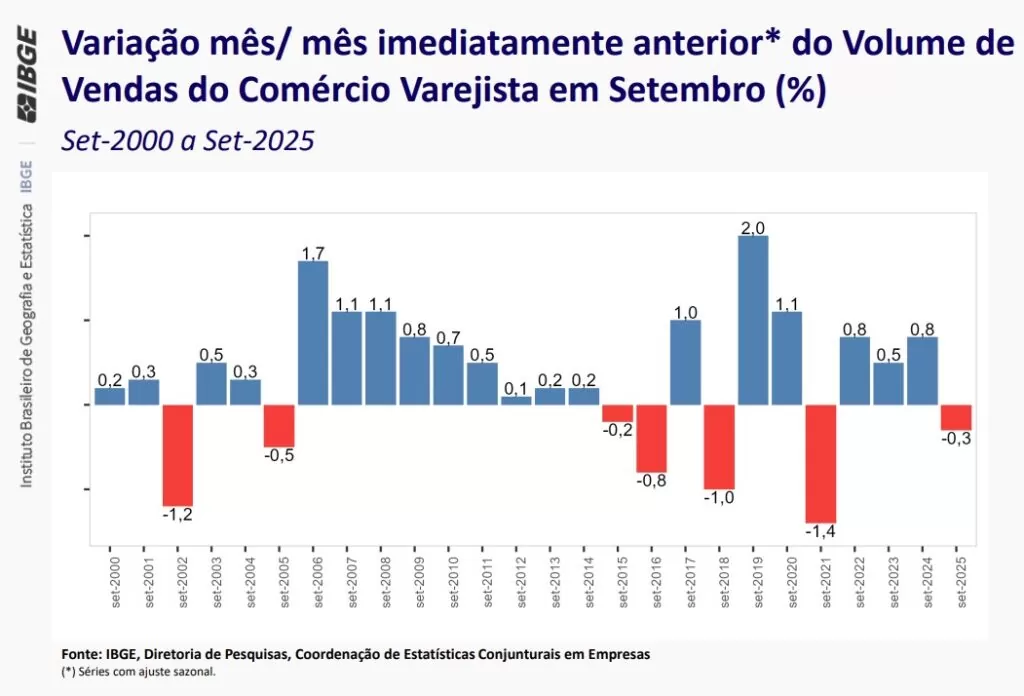 As vendas no varejo brasileiro recuaram 0,3% em setembro em relação a agosto, segundo dados divulgados nesta quinta-feira (13) pelo Instituto Brasileiro de Geografia e Estatística (IBGE).