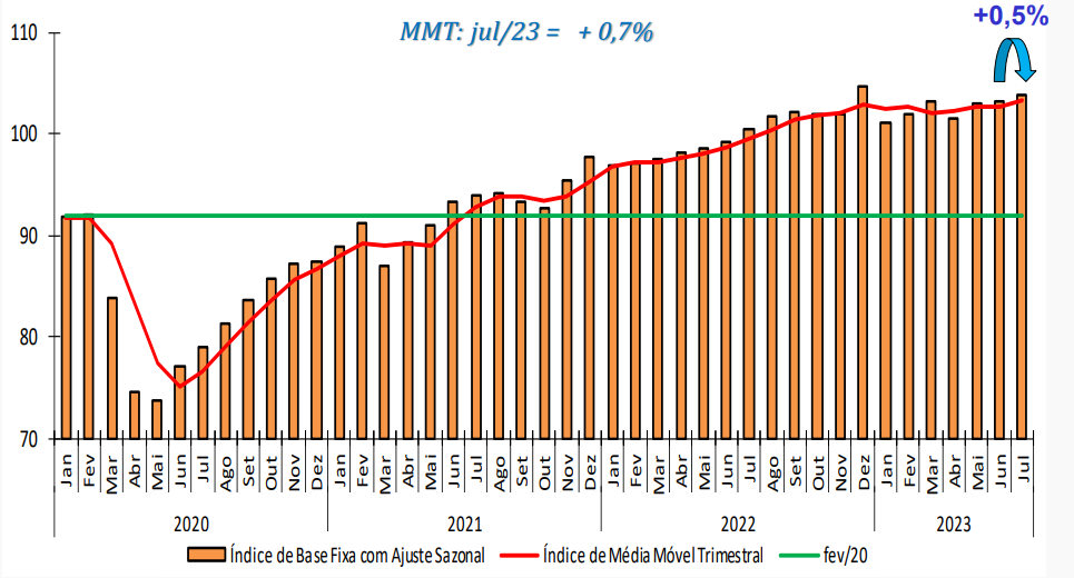 Os serviços prestados às famílias (1%) acumularam um ganho de 4,9% entre abril e julho. “O resultado de julho é o quarto positivo seguido dessa atividade.