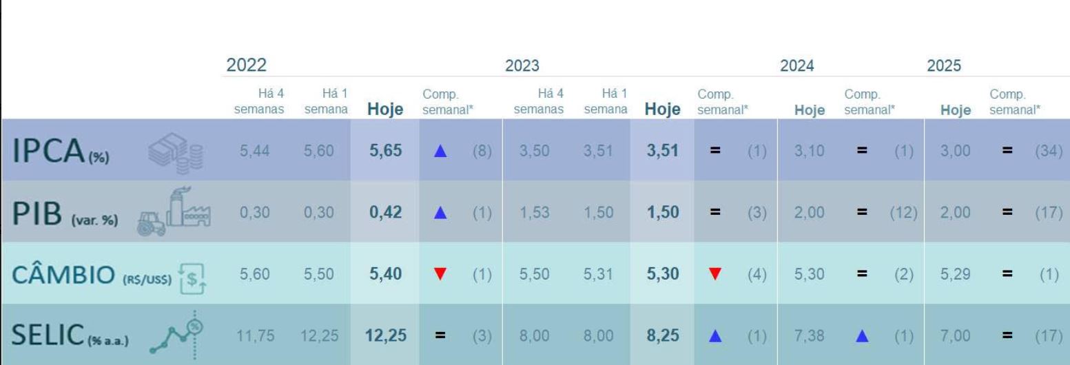 O câmbio por sua vez, recua de R$ 5,50 para R$ 5,40 em 2022, e recua de R$ 5,31 para R$ 5,30 em 2023.