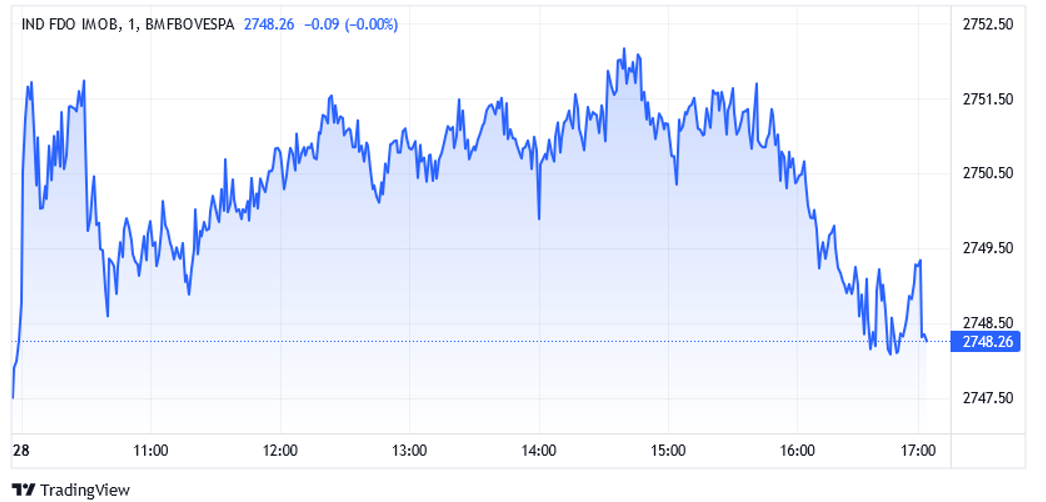 Em tinha de pouca volatilidade, o IFIX encerrou a sessão desta segunda-feira (28) na mínima de 2748 pontos, negativo em 0,01%.