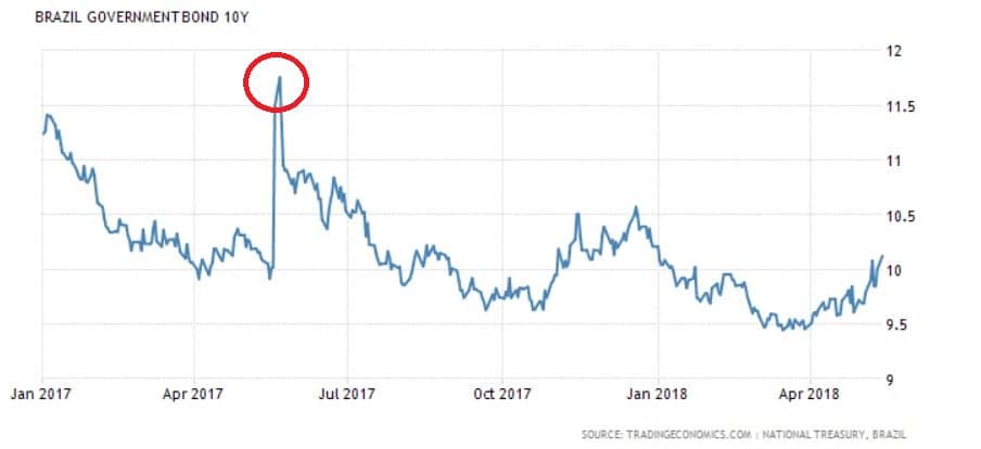 Refrescando a memória dos mais esquecidos, a manhã do dia 17 de maio registrou o maior pico de aumento do dólar em um dia, desde 1999. O Ibovespa, como mencionado no primeiro parágrafo, realizou uma parada emergencial em suas negociações (em virtude da queda abrupta no preço dos papéis). Para dimensionar melhor a importância do Joesley Day no mercado financeiro, cabe a lembrança de que este expediente fora utilizado apenas em 10 oportunidades anteriores. Abaixo, o gráfico dos juros futuros de 10 anos, na manhã do dia 17/05: Note como apesar do forte impacto inicial, os juros futuros voltaram a patamares muito próximos aos registrados antes do Josley Day.