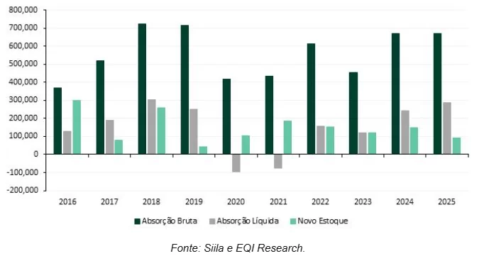Soma-se a isso um estoque que já não cresce em ritmo acelerado. Em 2025, a entrada de novo estoque na cidade foi de 92 mil m², 40% a menos do que no ano anterior.