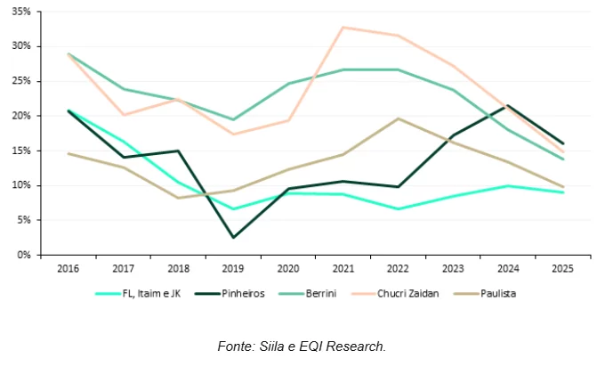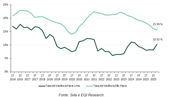 Após o pico de vacância na pandemia, a trajetória de queda foi rápida e consistente. Em 2023, 2024 e 2025, se estabilizou em torno de 8% a 11% na Faria Lima.