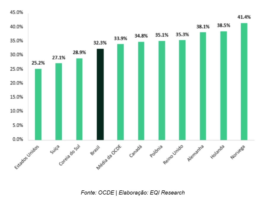 Ao olharmos para a OCDE, o clube dos países ricos, a carga tributária brasileira aparece abaixo da média, mas essa comparação é enganosa. Os países do grupo, em sua maioria desenvolvidos, sustentam modelos robustos de bem-estar social que naturalmente exigem tributos mais altos.