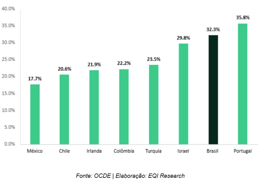 No Brasil, a comparação é dura. O IRPF pode chegar a 27,5% e o imposto sobre lucro de empresas no lucro real é de 34%.