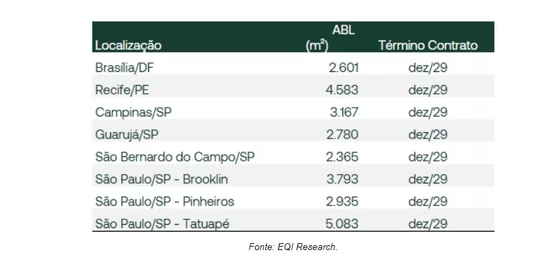 São oito contratos em três estados, todos com vencimento em 2029. Uma das características é que o FII possui imóveis menores em área bruta locável (ABL) e o inquilino representa cerca de 8,1% do total das receitas do Fundo.