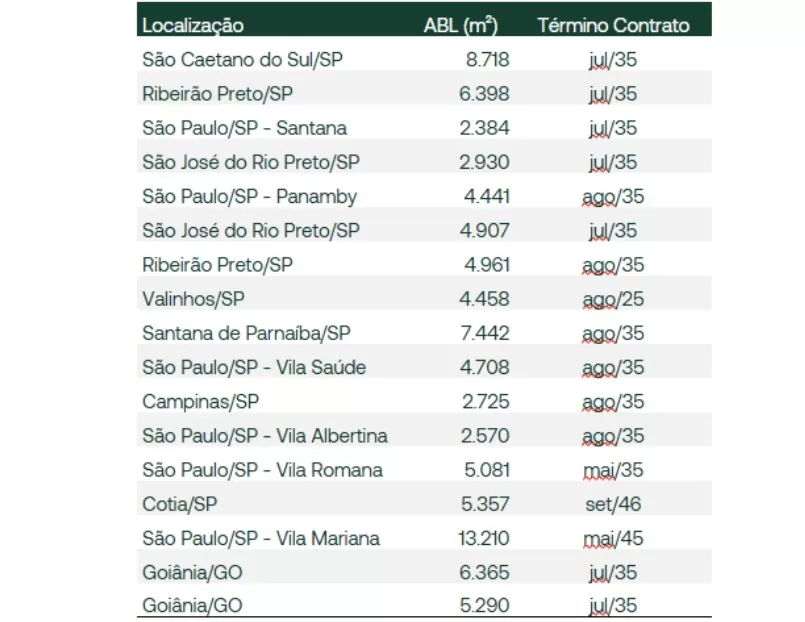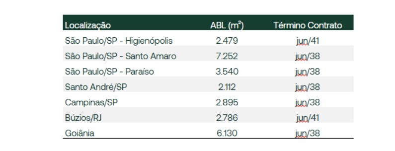 São 19 contratos de locação, com contratos atípicos, localizados no estado de São Paulo e Goiânia (via TRXB). Há algumas lojas maiores, como na Vila Mariana/SP e em São Caetano do Sul/SP, e a exposição em termos de receita também é de cerca de 8%.