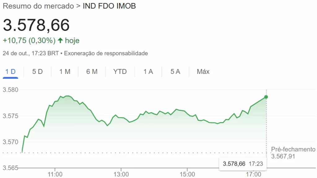 O IFIX hoje (24) encerrou o dia em alta de 0,30%, aos 3.578,66 pontos. A mínima do dia foi de 3.567,34 pontos. Já a máxima do dia foi de 3.579,11 pontos. Na semana, o índice acumula leve elevação de 0,03%.