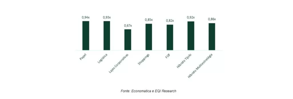 Relação entre preço e valor patrimonial (P/VP) por setor de FII