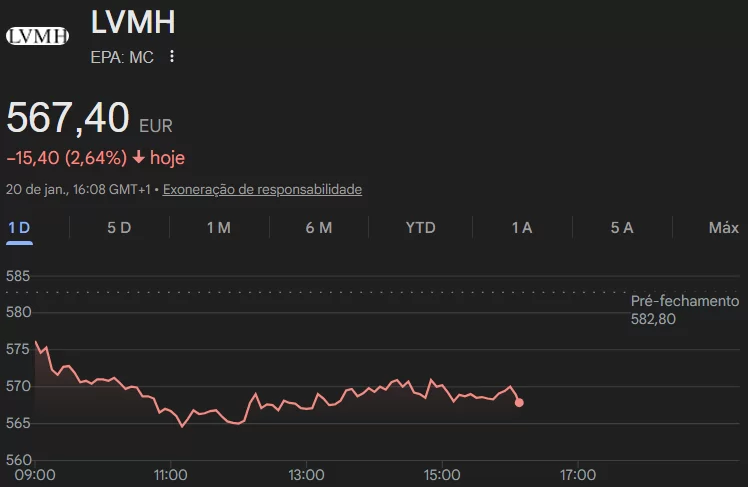 As ações da LVMH operam em queda por volta das 12h desta terça-feira (20).