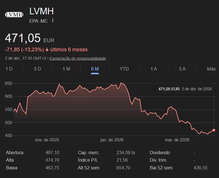 A LVMH registrou o pior desempenho de ações para um primeiro trimestre desde que há registros, com queda de cerca de 28%. O resultado supera momentos críticos como a crise financeira de 2008 e a pandemia de Covid-19.