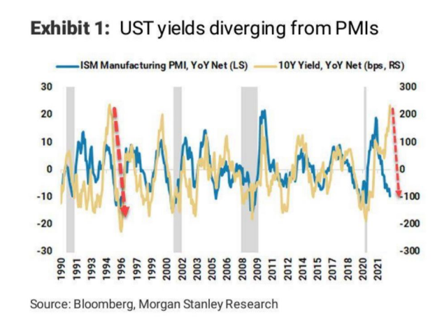 A divergência dos yields com indicador de produção industrial está em níveis vistos pela última vez em 1994, quando após queda brusca na atividade, os yields despencaram também…