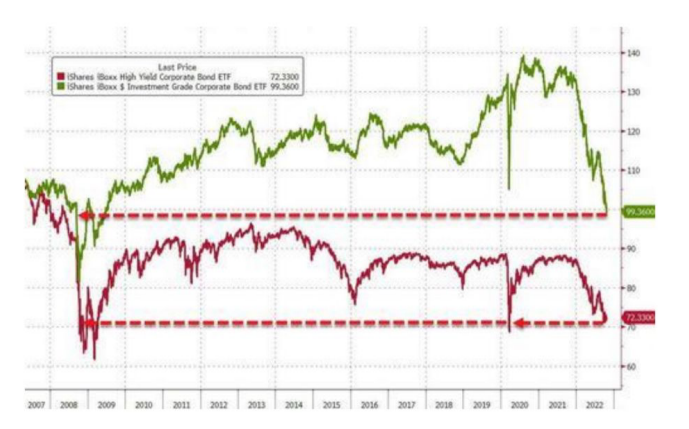 Bonds investment grade (LQD) e high yield (HYG) estão respectivamente em níveis da crise de 2008, após quebra do Lehman, e março de 2020, após estouro do Covid, quando o Fed começou a comprar junk bonds.