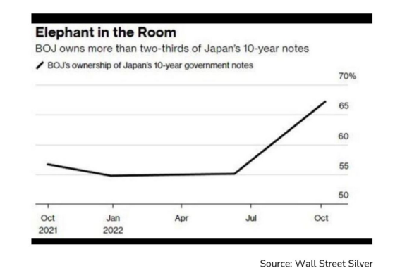 O Banco do Japão é dono de 67,2% dos bonds de 10 anos existentes. Isso mesmo: o Banco do Japão está criando dinheiro para emprestar ao governo que deve para o governo.