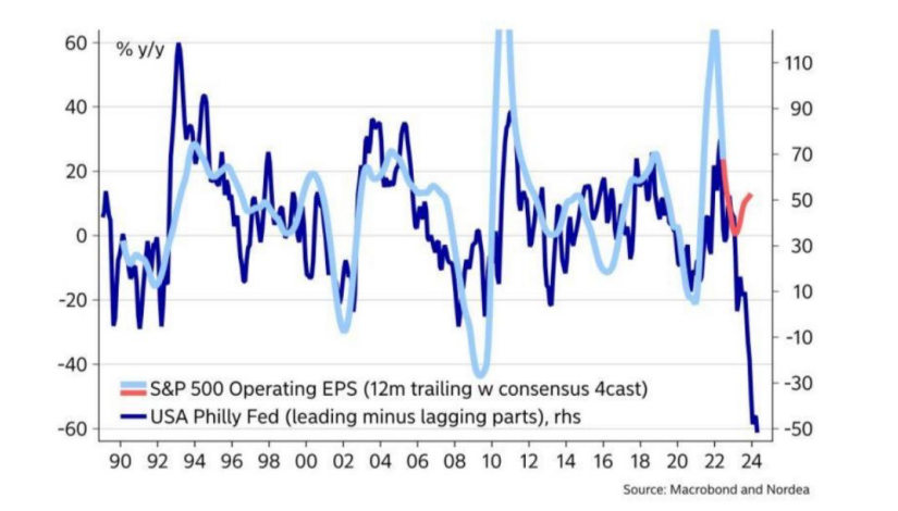 Já existe uma grande divergência entre as condições gerais de negócio percebida pelos fabricantes (USA Philly FED) e consenso sobre resultado operacional das empresas.