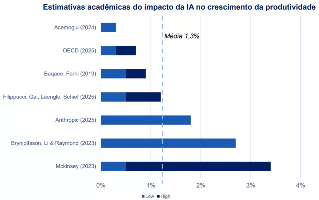 Já o BTG apresentou um ponto de vista diferente. O primeiro motivo apontado é o ganho de produtividade. O banco de investimentos cita que em estudos acadêmicos, políticos e industriais independentes, os ganhos de produtividade impulsionados pela IA atingem uma média de cerca de 1,3 p.p. por ano — o equivalente a mais de US$ 1,5 trilhão de produção global extra anualmente, com base no PIB atual —, sugerindo um choque de produtividade amplo e duradouro.