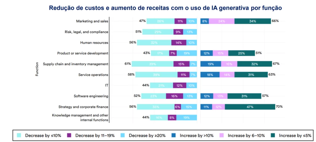 “A IA generativa está gerando reduções mensuráveis de custos e ganhos de receita em todas as funções avaliadas, com o maior impacto observado em estratégia e finanças (70%), cadeia de suprimentos (67%) e operações de serviços (63%)”, diz o relatório do BTG.