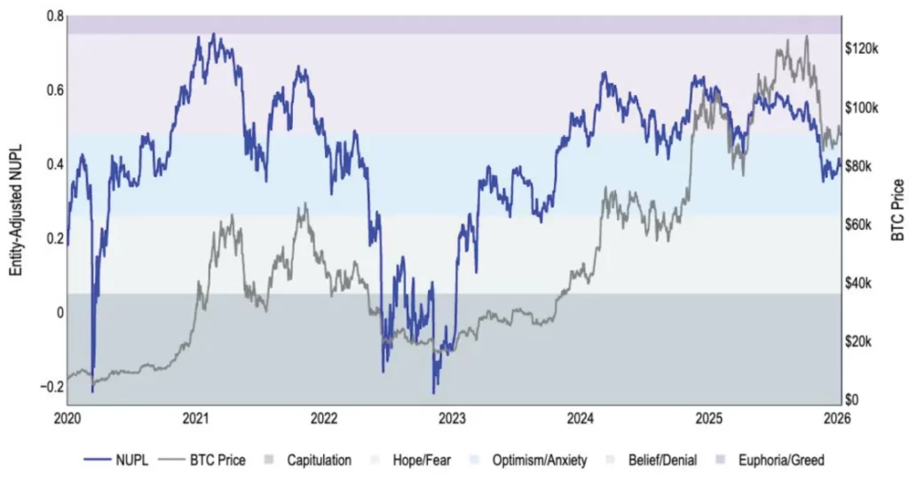 Ao entrar no primeiro trimestre de 2026, o sentimento do Bitcoin permanece moderado. Indicadores como o Net Unrealized Profit/Loss (NUPL) migraram da faixa de “crença” para “ansiedade” após a liquidação ocorrida em outubro.
