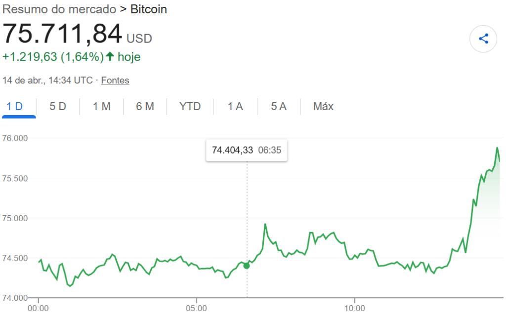 Na manhã de hoje, o Bitcoin hoje registrava alta de 5,3%, cotado a US$ 74.524. Em reais, a criptomoeda era negociada a R$ 372.321, segundo dados do Portal do Bitcoin.