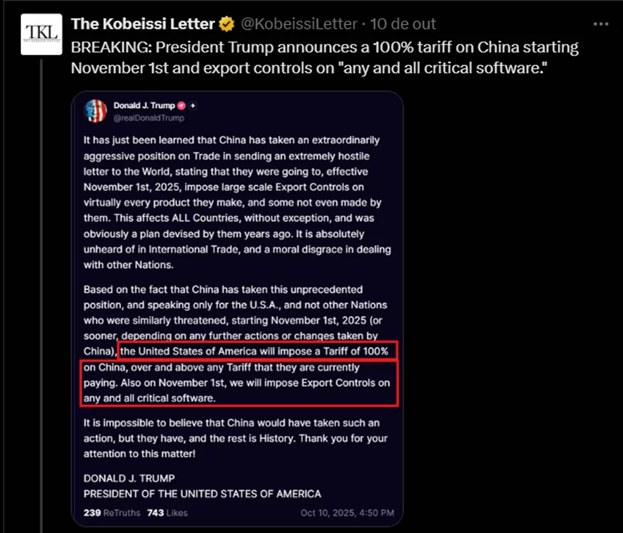 O principal gatilho foi a crise tarifária entre as duas maiores economias do mundo. As novas medidas impostas por Washington, somadas às retaliações anunciadas, reacenderam o temor de desaceleração global. Fator que costuma pressionar mercados de risco, incluindo criptoativos.