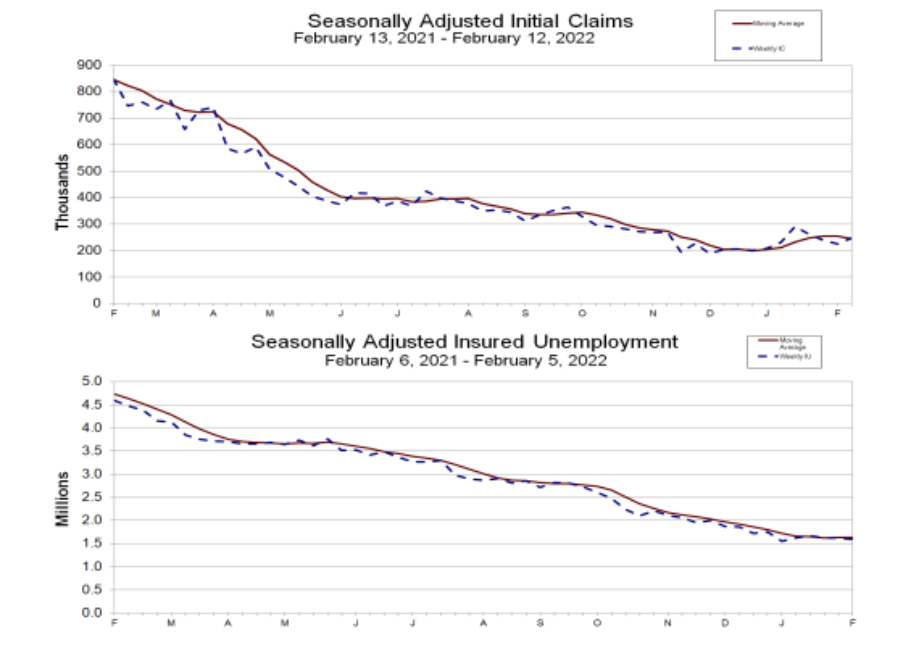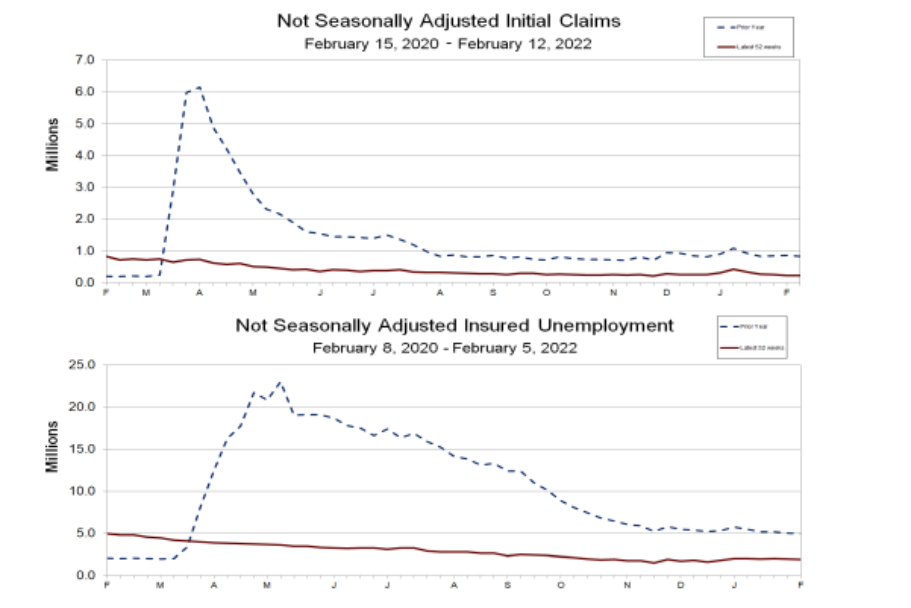 Os pedidos iniciais de benefícios de UI ((Unemployment Insurance) apresentados por ex-funcionários civis federais totalizaram 624 na semana que terminou em 5 de fevereiro, uma diminuição de 27 em relação à semana anterior. Houve 372 reclamações iniciais arquivadas por veteranos recém dispensados, uma diminuição de 33 da semana anterior.