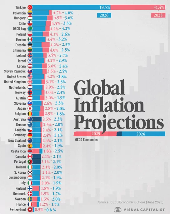 O dólar mais fraco tende a ser desinflacionário, como mostra o gráfico abaixo, a maioria dos países da OCDE projeta inflação menor em 2026, refletindo esse movimento global.