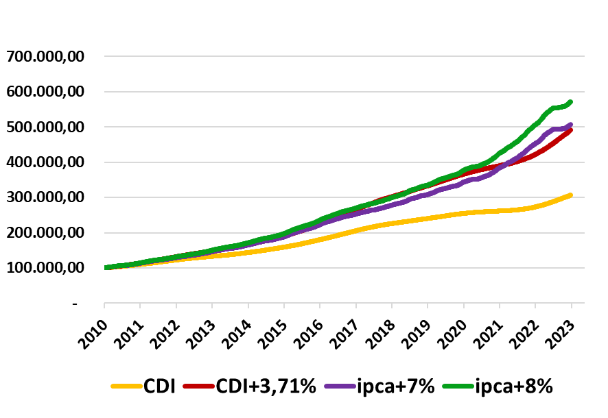 Agora observe a simulação abaixo, de um investimento de R$ 100.000 em 2010, com as taxas de retorno citadas nos parágrafos acima: