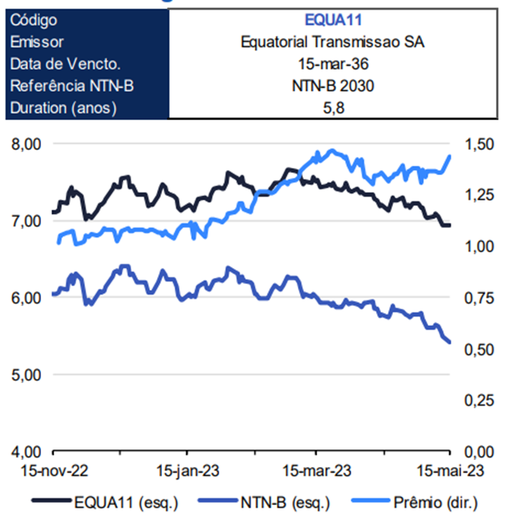 No gráfico acima, podemos ver a taxa de retorno da debênture EQUA11, da empresa Equatorial triplo AAA (em preto); a taxa de retorno da NTN-B (azul forte); e a diferença entre os dois, que seria o prêmio de risco (azul fraco).