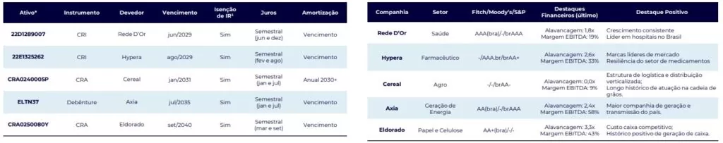 A carteira de títulos de renda fixa para abril priorizam a exposição aos setores de saúde, com a inclusão de papéis como Rede D´Or (2029) e da Hypera (2029) e ainda da Axia Energia (título de 2035). Eles substituem ativos ligados ao Rumo (2029), Prio (2032) e o título de 2034 da Axia, além de Ecorodovias (2039).