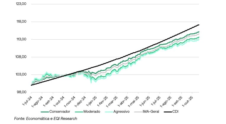 As carteiras recomendadas da EQI Research apresentaram desempenho positivo em outubro, embora novamente abaixo do CDI no período. As alterações implementadas no início do mês — que aumentaram a duration das carteiras — ainda não trouxeram o retorno esperado. Além disso, essas mudanças reduziram a taxa de carrego em relação ao CDI, limitando a performance no curto prazo.