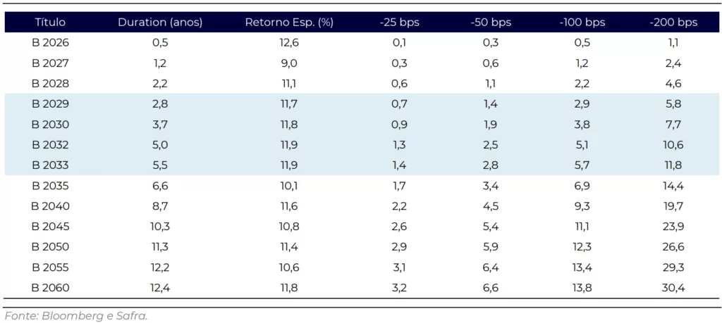 Desse modo, a recomendação do Safra é priorizar os títulos NTN-Bs com vencimentos intermediários, entre 2029 e 2033, pela melhor relação risco-retorno e proteção inflacionária, evitando vértices muito curtos ou excessivamente longos – voltado para perfis mais resilientes à volatilidade de mercado.