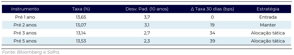 Já para as LTNs, a recomendação do Safra é manter posições no curto prazo – em até dois anos – e avaliar entradas em prazos acima de três anos para aproveitar esse carrego considerado atrativo.