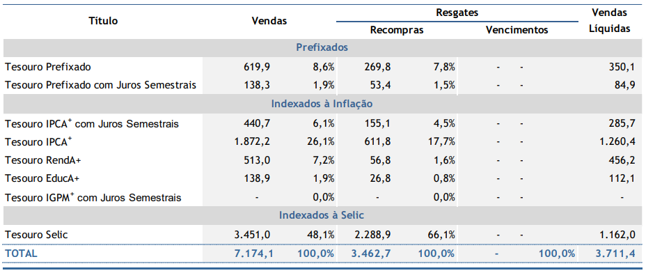 Os títulos indexados à inflação mantiveram a liderança na composição do estoque, respondendo por 50,8% do total. Em seguida vieram os papéis atrelados à Selic (36,7%) e, por fim, os prefixados (12,5%).